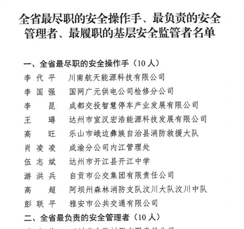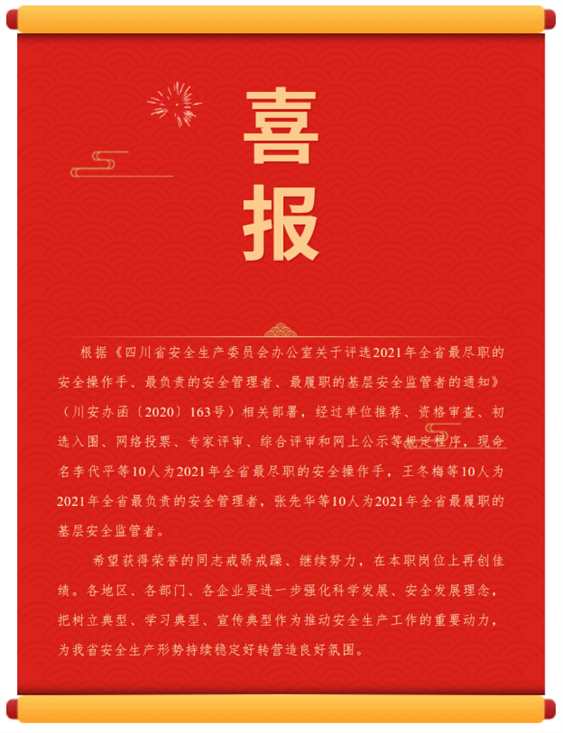 此次評選活動,最終命名“全省最盡職的安全操作手、最負責的安全管理者、最履職的基層安全監(jiān)管者”各10名。彭聯(lián)平通過單位自薦、資格審查、初選入圍、網(wǎng)絡(luò)投票、專家評審、綜合評審和網(wǎng)上公示層層選拔,最終獲得“2021年全省最盡職的安全操作手”稱號,是雅安市唯一獲此殊榮的個人。