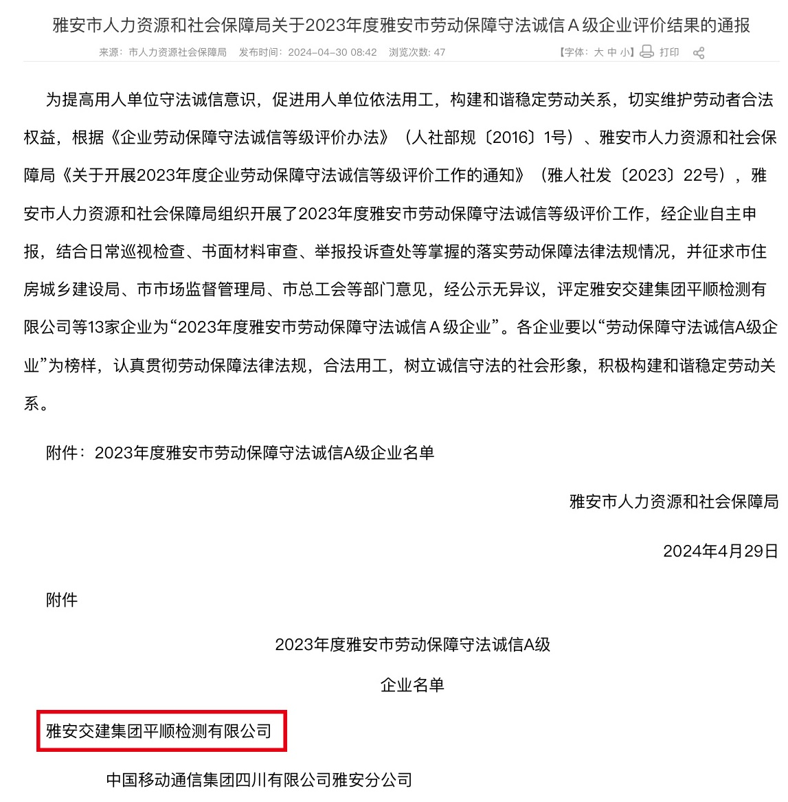 近日,雅安市人社局發(fā)布通報(bào),雅安交建集團(tuán)平順公司被評(píng)定為“2023年度雅安市勞動(dòng)保障守法誠(chéng)信A級(jí)企業(yè)”。此次評(píng)選由人社局結(jié)合日常巡視檢查、書(shū)面材料審查、舉報(bào)投訴查處以及專項(xiàng)檢查等活動(dòng)掌握的落實(shí)勞動(dòng)保障法律法規(guī)情況,并征求市場(chǎng)監(jiān)管局等部門和單位意見(jiàn)后,綜合評(píng)定而出。