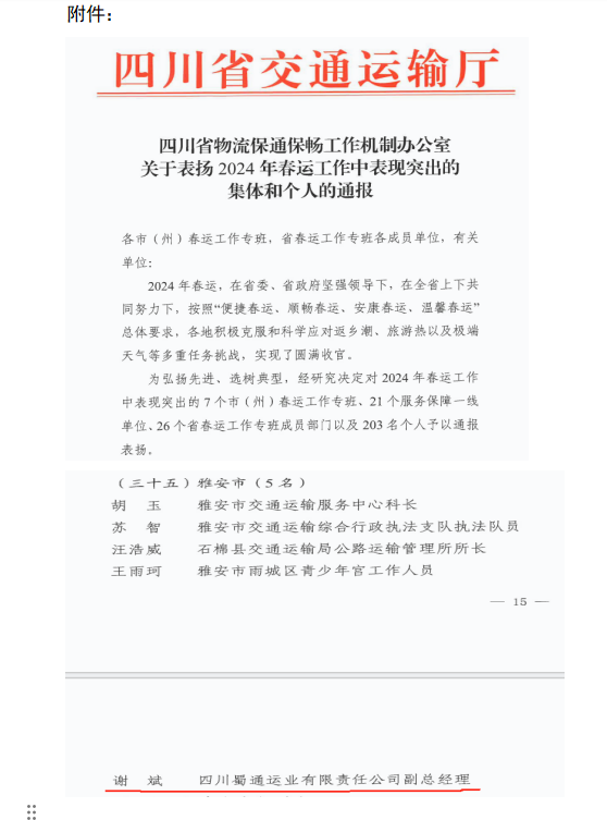 近日,交建集團蜀通公司副總經(jīng)理謝斌獲四川省交通運輸廳2024年春運工作表現(xiàn)突出通報表揚。
