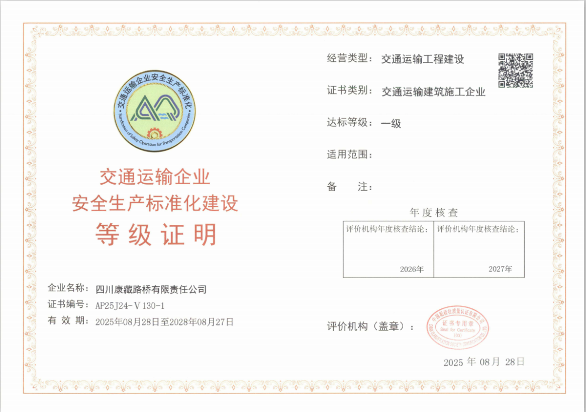近日,經(jīng)交通運輸部交通運輸企業(yè)安全生產(chǎn)標(biāo)準(zhǔn)化評價機構(gòu)綜合評定,康藏路橋公司獲評安全標(biāo)準(zhǔn)化一級企業(yè)并取得證書,標(biāo)志其安全生產(chǎn)管理體系獲國家最高標(biāo)準(zhǔn)認(rèn)可。