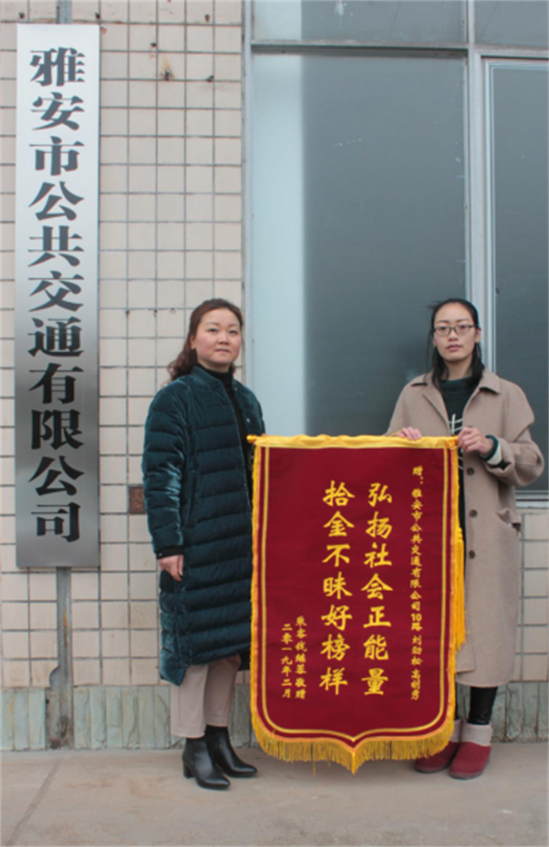 “請一定把我們的感謝帶給駕駛員和發(fā)班員!2月14日下午17時(shí)15分左右,一名手拿寫著“拾金不昧好榜樣弘揚(yáng)社會(huì)正能量”錦旗的市民錢續(xù)露來到雅安市公共交通有限公司,將錦旗送到了經(jīng)理助理方媛手上,請她把感謝之意轉(zhuǎn)達(dá)給10路公交車駕駛員劉進(jìn)松和發(fā)班員高胡秀。