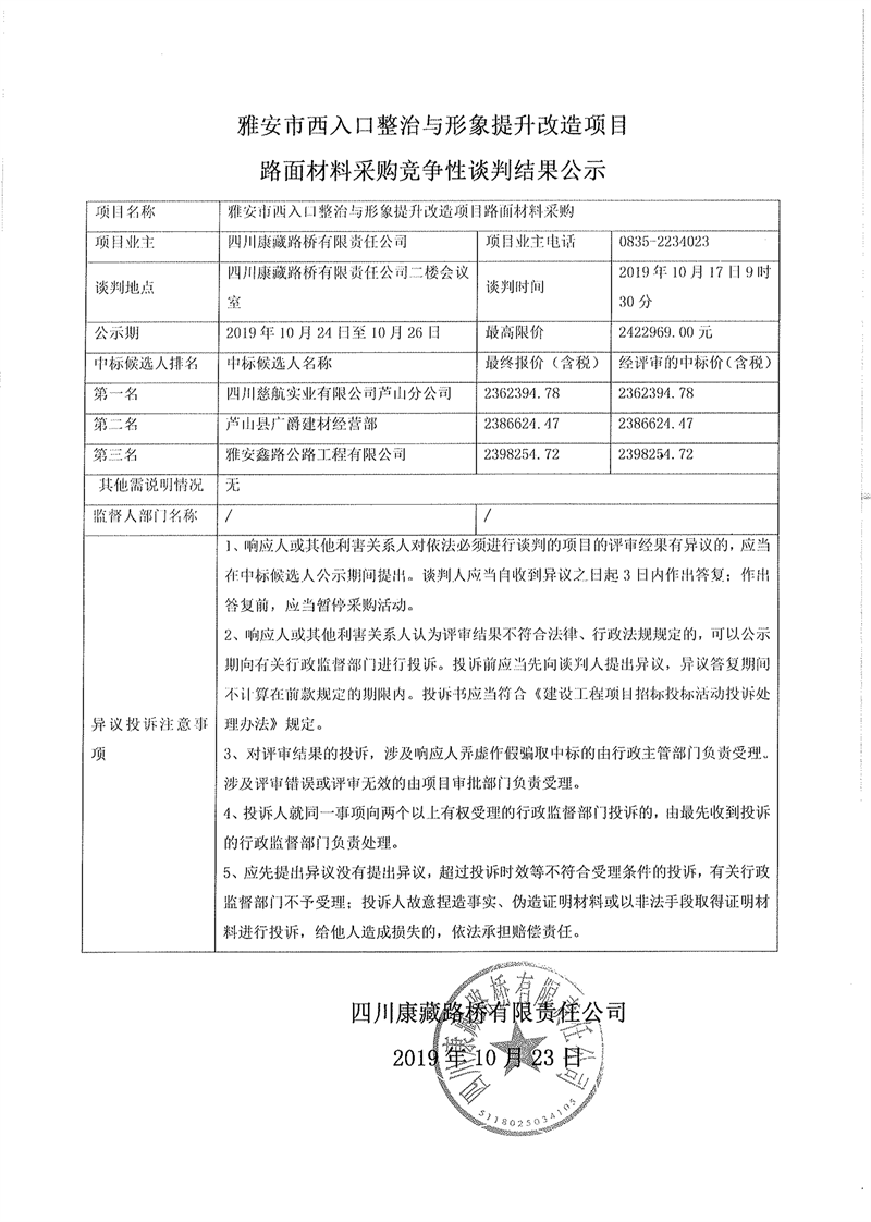 四川康藏路橋有限責(zé)任公司雅安市西入口整治與形象提升改造項(xiàng)目路面材料采購(gòu)競(jìng)爭(zhēng)性談判結(jié)果公示