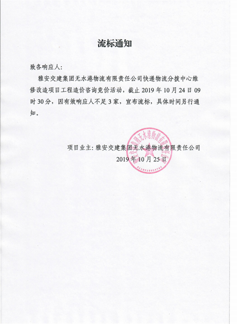 雅安交建集團無水港物流有限責(zé)任公司快遞物流分撥中心維修改造項目工程造價咨詢競價流標(biāo)通知