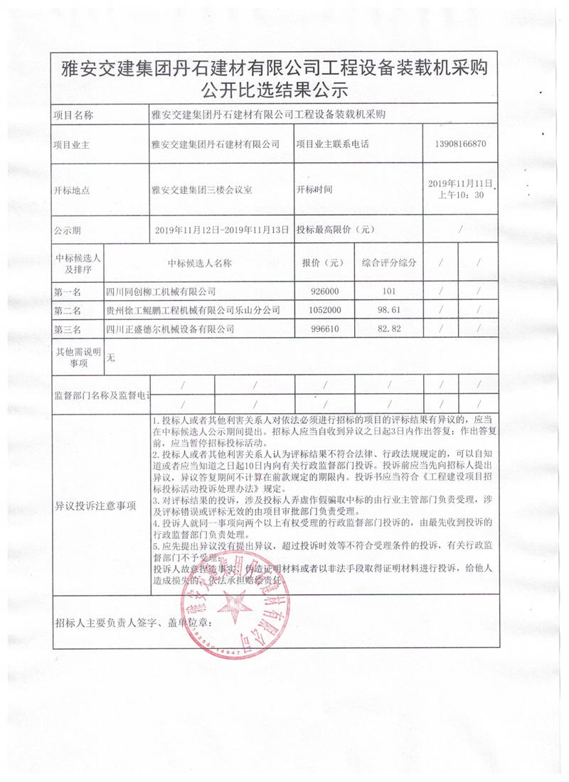 雅安交建集團(tuán)丹石建材有限公司工程設(shè)備裝載機采購公開比選結(jié)果公示