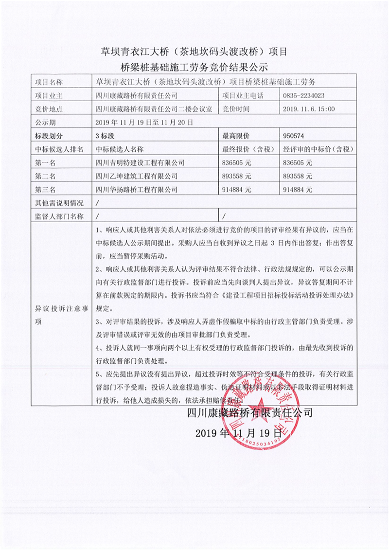 四川康藏路橋有限責任公司草壩青衣江大橋(茶地坎碼頭渡改橋)項目橋梁樁基礎(chǔ)施工勞務(wù)競價(3標段)結(jié)果公示