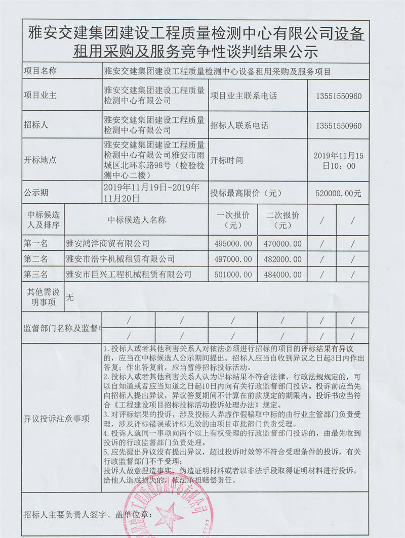 雅安交建集團建設(shè)工程質(zhì)量檢測中心有限公司設(shè)備租用采購及服務(wù)競爭性談判結(jié)果公示