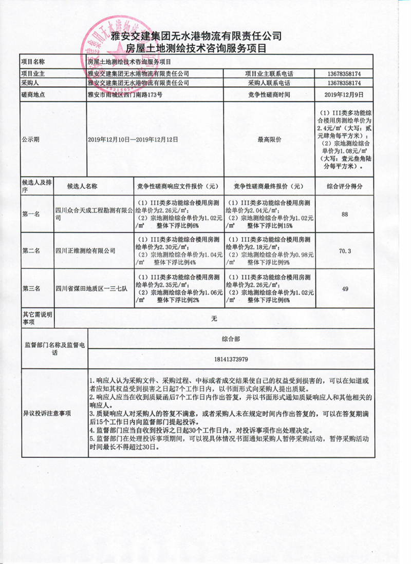 雅安交建集團無水港物流有限責任公司房屋土地測繪技術(shù)咨詢服務項目競爭性磋商結(jié)果公示