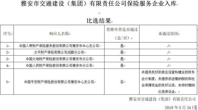 雅安市交通建設(集團)有限責任公司保險服務企業(yè)入庫比選結(jié)果公示