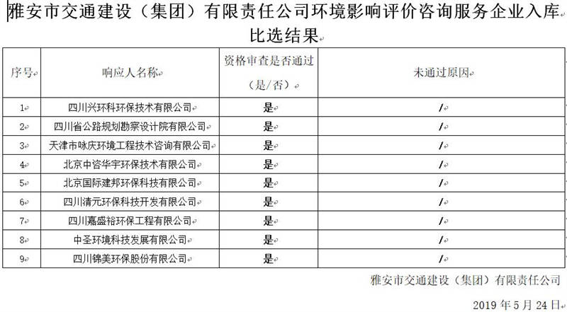雅安市交通建設(集團)有限責任公司環(huán)境影響評價咨詢服務企業(yè)入庫比選結果公示