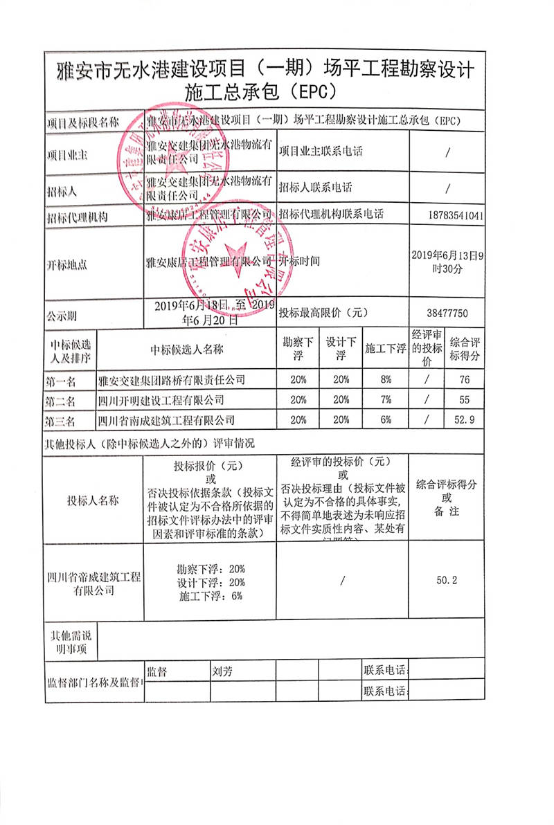 雅安市無水港建設(shè)項目(一期)場平工程勘察設(shè)計施工總承包(EPC)公開招標(biāo)結(jié)果公示