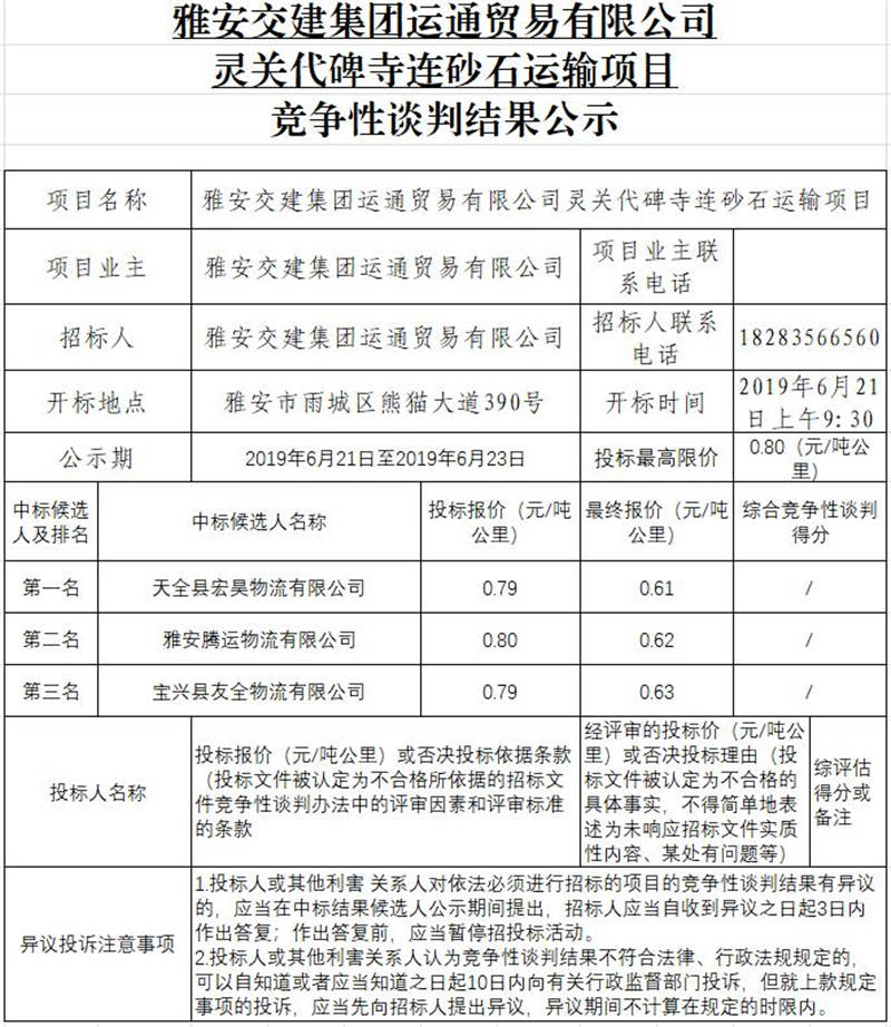 雅安交建集團運通貿(mào)易有限公司靈關(guān)代碑寺連砂石運輸項目競爭性談判結(jié)果公示