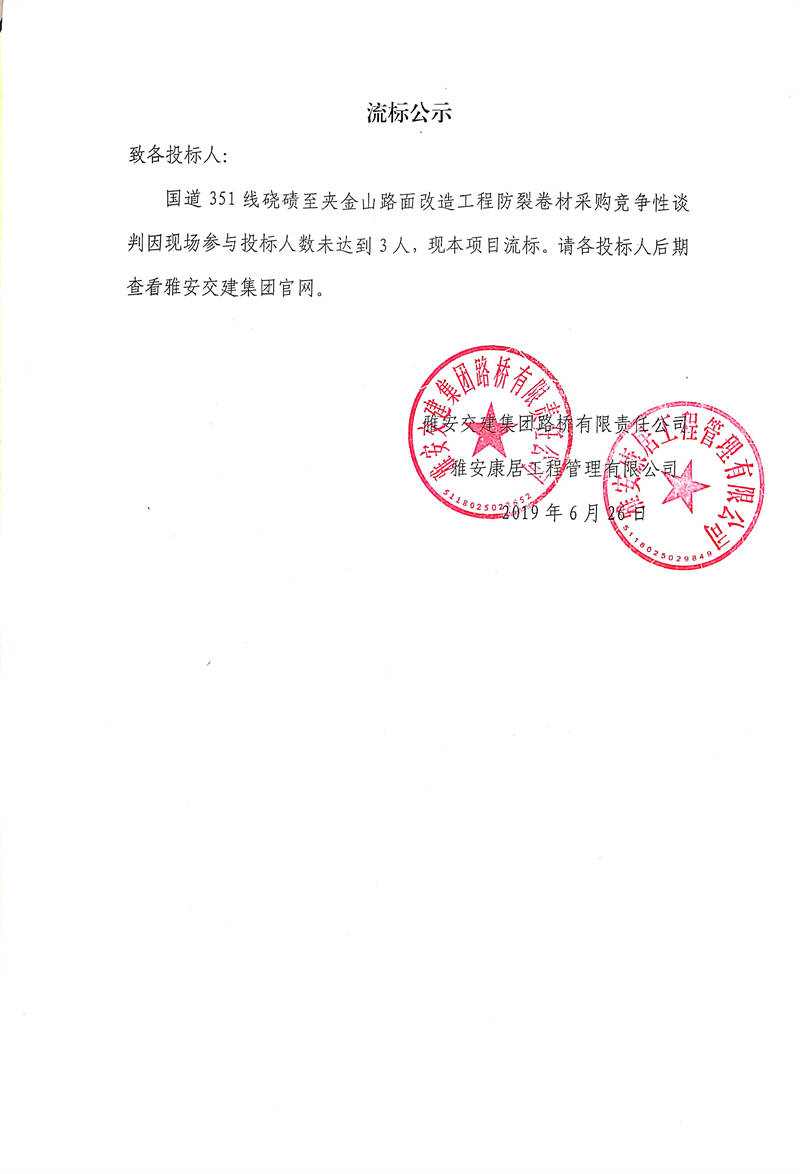 雅安交建集團(tuán)路橋有限責(zé)任公司國道351線磽磧至夾金山路面改造工程防裂卷材采購競爭性談判流標(biāo)公示