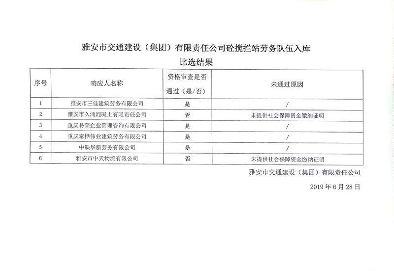 雅安市交通建設(shè)(集團)有限責任公司砼攪攔站勞務(wù)隊伍入庫比選結(jié)果