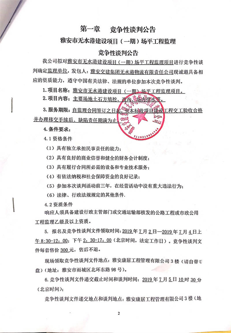 雅安交建集團無水港物流有限責任公司雅安市無水港建設項目(一期)場平工程監(jiān)理競爭性談判公告