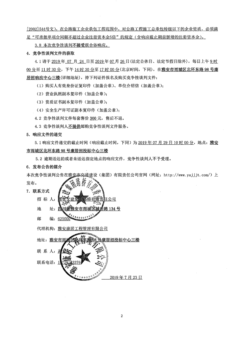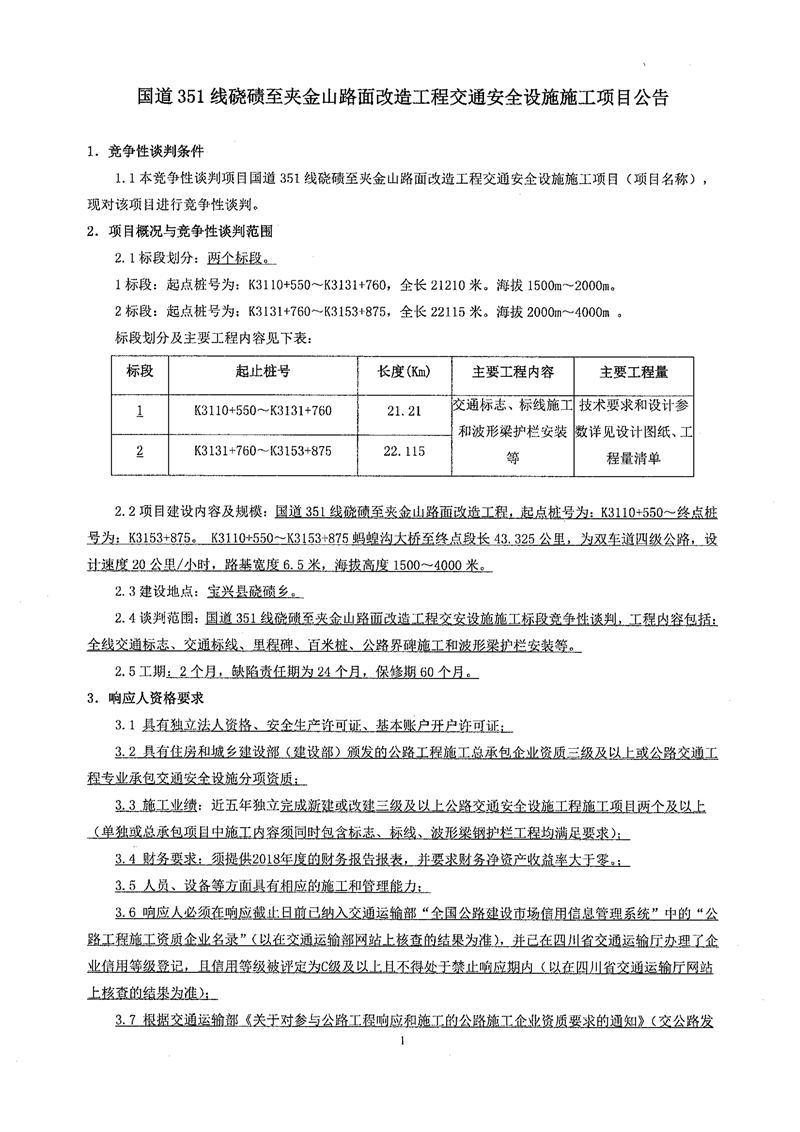 雅安交建集團路橋有限責任公司國道351線磽磧至夾金山段路面改造工程交通安全設(shè)施施工項目競爭性談判公告