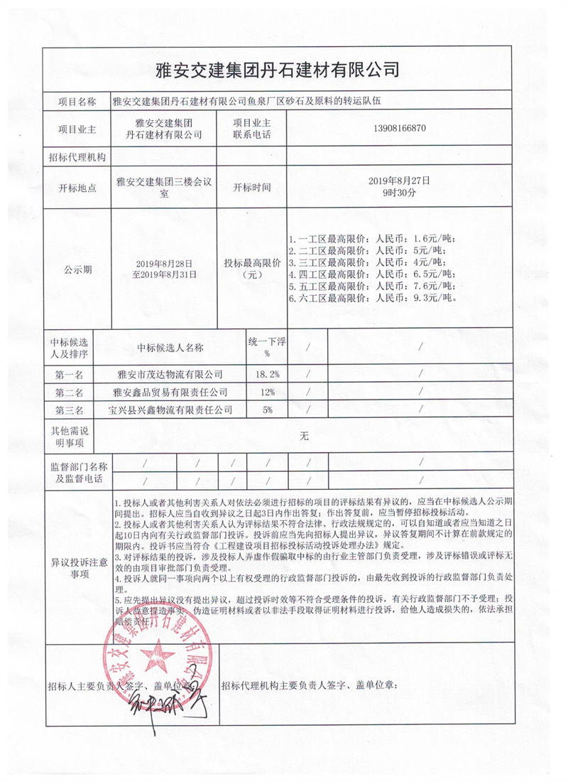 雅安交建集團丹石建材有限公司魚泉廠區(qū)砂石及原料的轉運隊伍項目競價結果公示