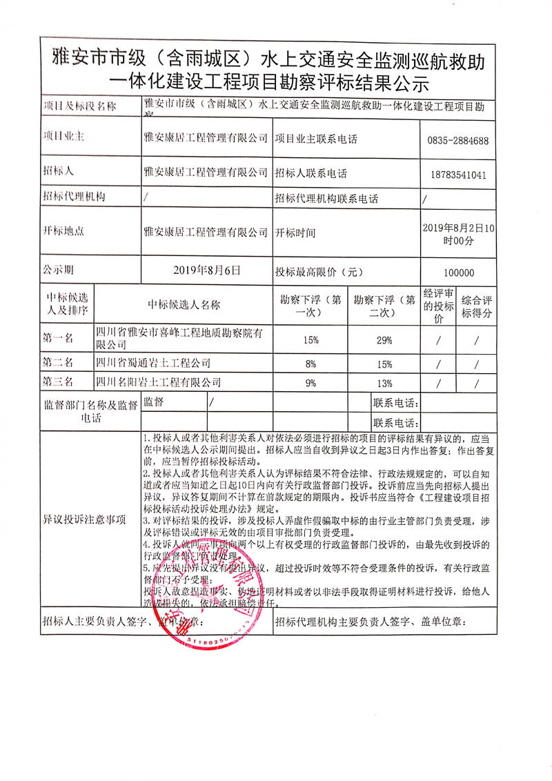 雅安康居工程管理有限公司雅安市市級(含雨城區(qū))水上交通安全監(jiān)測巡航救助一體化建設(shè)工程項目勘察評標(biāo)結(jié)果公示