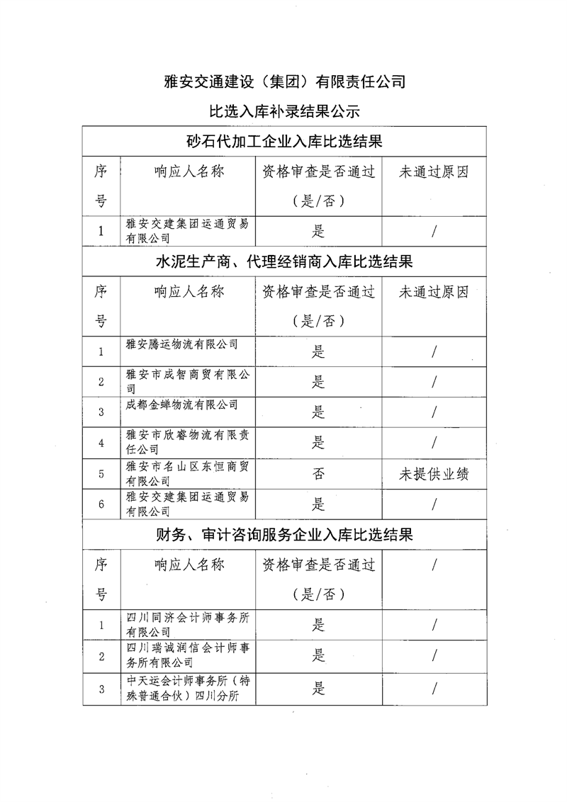 雅安交通建設(shè)(集團)有限責(zé)任公司比選入庫補錄結(jié)果公示