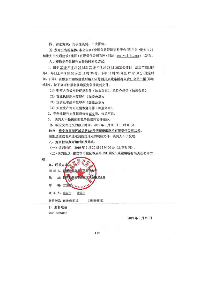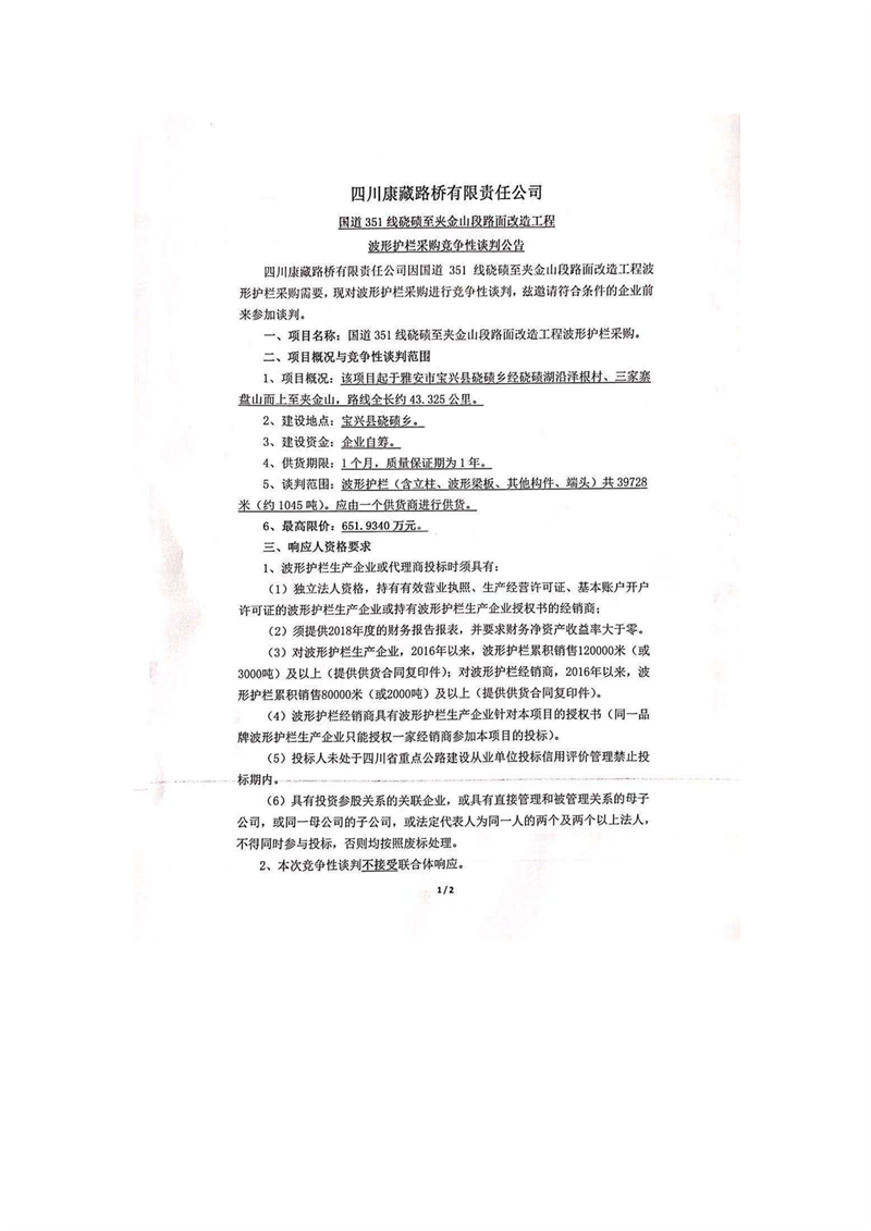 四川康藏路橋有限責任公司國道351線磽磧至夾金山段路面改造工程波形護欄采購競爭性談判公告