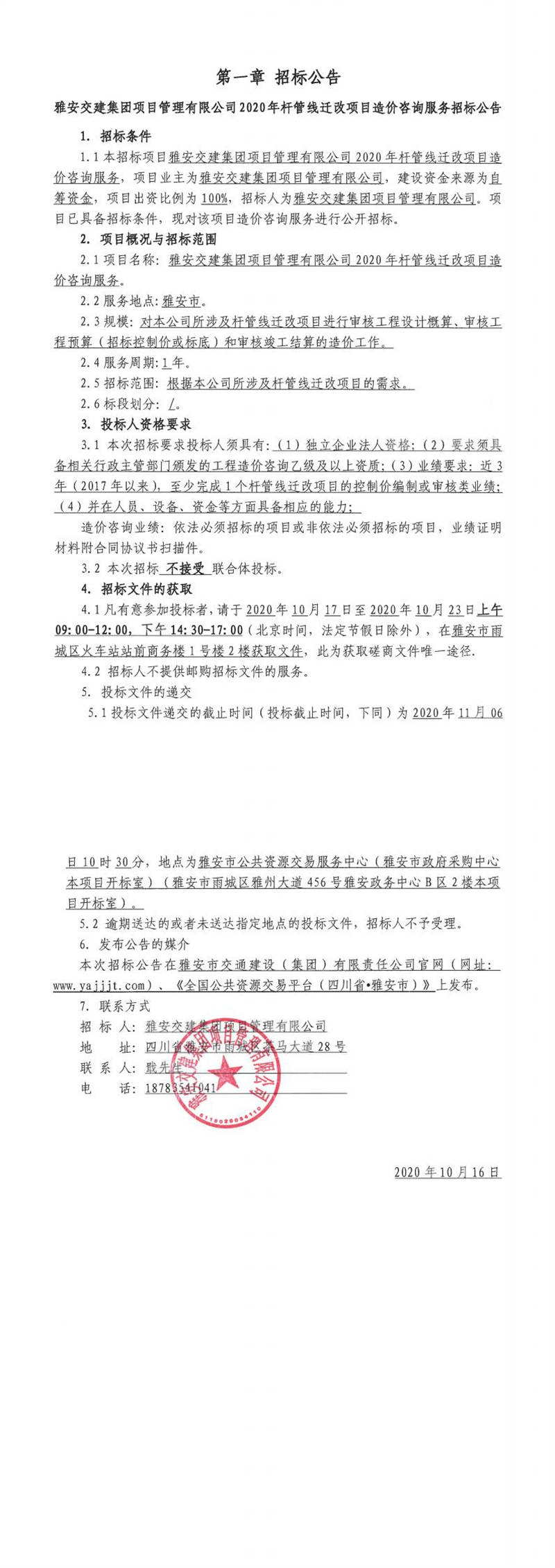 雅安交建集團項目管理有限公司2020年桿管線遷改項目造價咨詢服務(wù)招標公告