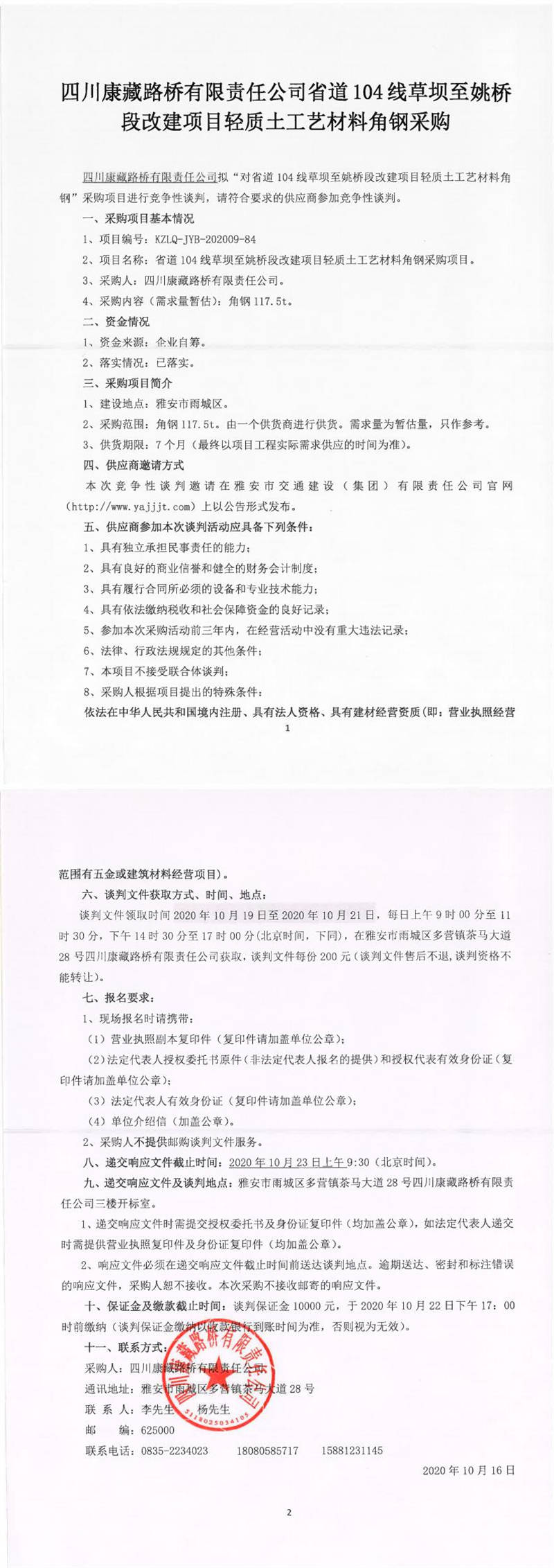 四川康藏路橋有限責(zé)任公司省道104線草壩至姚橋段改建項目輕質(zhì)土工藝材料角鋼采購競爭性談判公告