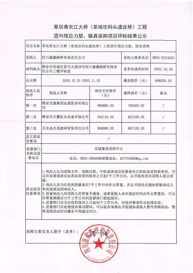 四川康藏路橋有限責(zé)任公司草壩青衣江大橋(茶地坎碼頭渡改橋)工程豎向預(yù)應(yīng)力筋、錨具采購項目評標結(jié)果公示