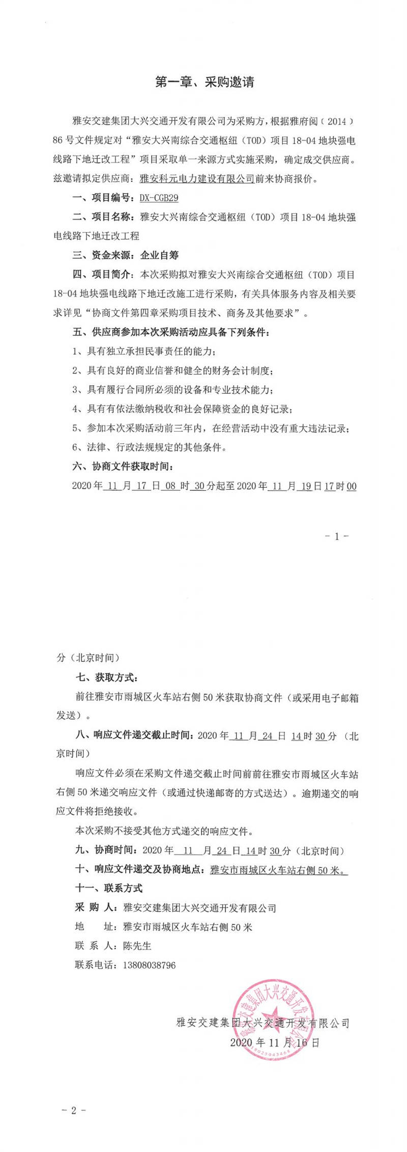 雅安交建集團(tuán)大興交通開發(fā)有限公司雅安大興南綜合交通樞紐(TOD)項(xiàng)目18-04地塊強(qiáng)電線路下地遷改工程單一來源采購(gòu)邀請(qǐng)