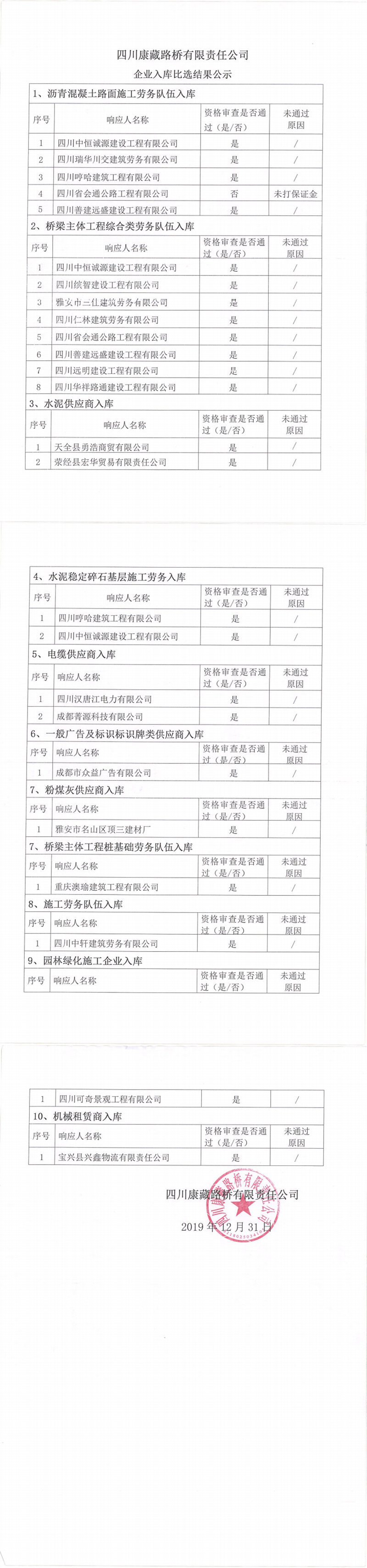 四川康藏路橋有限責任公司企業(yè)入庫比選結果公示