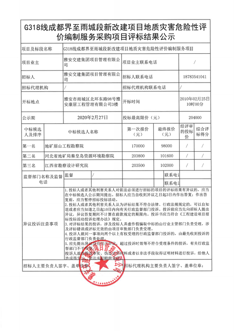 雅安交建集團項目管理有限公司G318線成都界至雨城段新改建項目地質(zhì)災害危險性評價編制服務項目評標結(jié)果公示