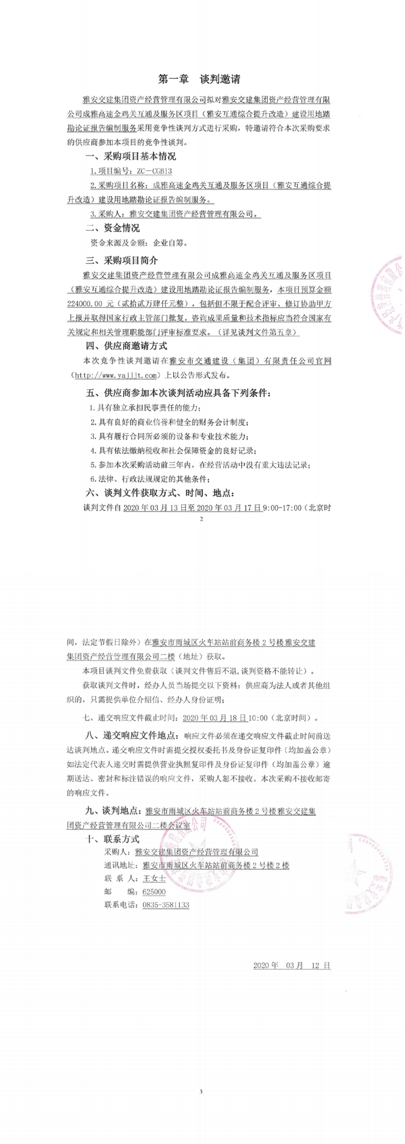 雅安交建集團資產(chǎn)經(jīng)營管理有限公司成雅高速金雞關(guān)互通及服務區(qū)項目(雅安互通綜合提升改造)建設用地踏勘論證報告編制服務競爭性談判公告
