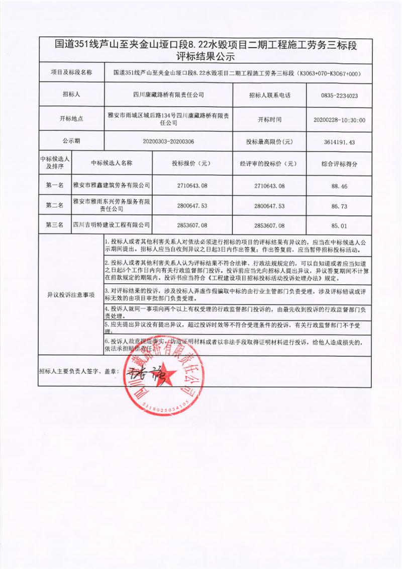 四川康藏路橋有限責(zé)任公司國(guó)道351線蘆山至夾金山埡口段8.22水毀項(xiàng)目二期工程施工勞務(wù)三標(biāo)段評(píng)標(biāo)結(jié)果公示