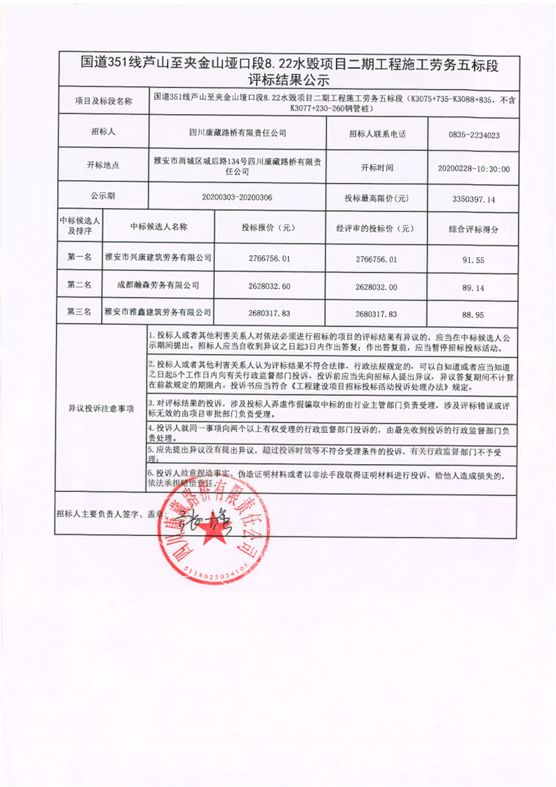 四川康藏路橋有限責(zé)任公司國(guó)道351線(xiàn)蘆山至夾金山埡口段8.22水毀項(xiàng)目二期工程施工勞務(wù)五標(biāo)段評(píng)標(biāo)結(jié)果公示