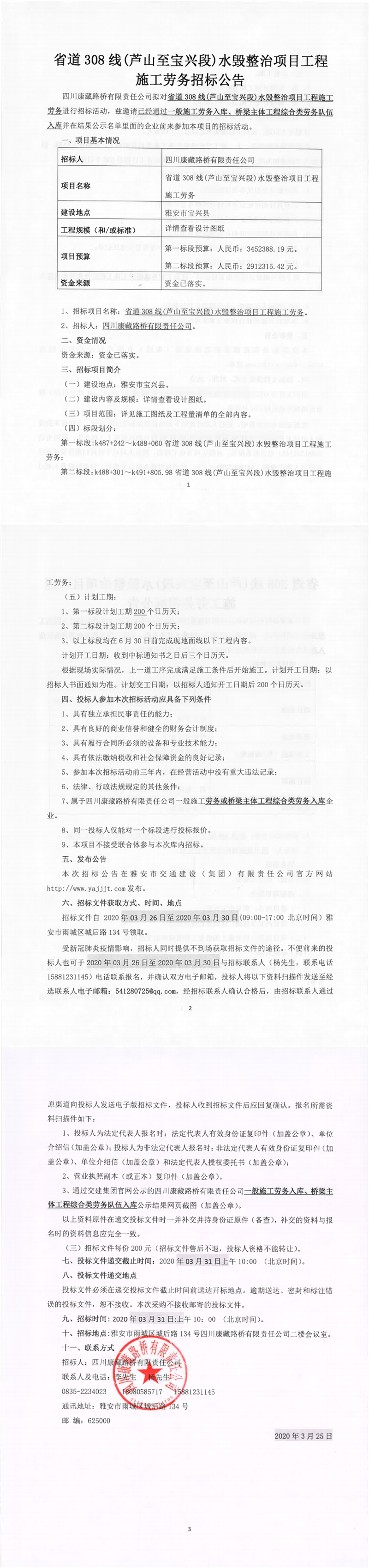 四川康藏路橋有限責(zé)任公司省道308線(蘆山至寶興段)水毀整治項目工程施工勞務(wù)招標(biāo)公告