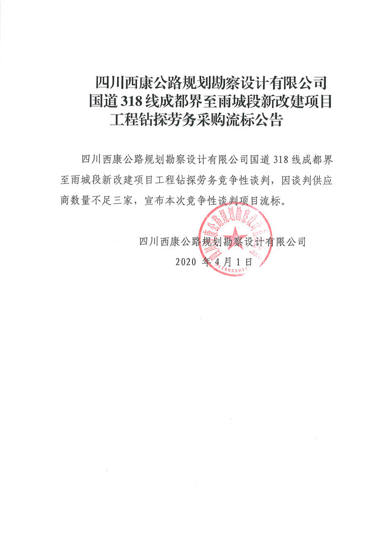 四川西康公路規(guī)劃勘察設(shè)計有限公司國道318線成都界至雨城段新改建項目工程鉆探勞務(wù)采購流標公告