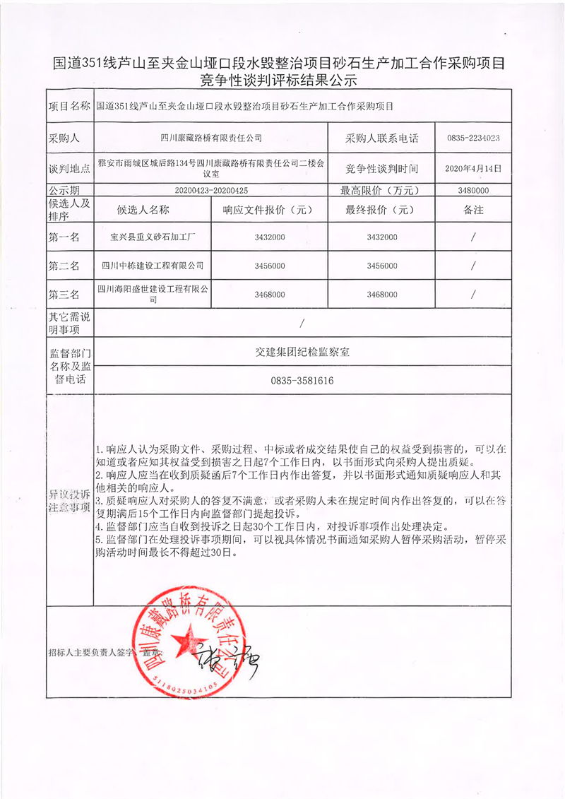 四川康藏路橋有限責(zé)任公司國(guó)道351線蘆山至夾金山埡口段水毀整治項(xiàng)目砂石生產(chǎn)加工合作采購(gòu)項(xiàng)目競(jìng)爭(zhēng)性談判評(píng)標(biāo)結(jié)果公示