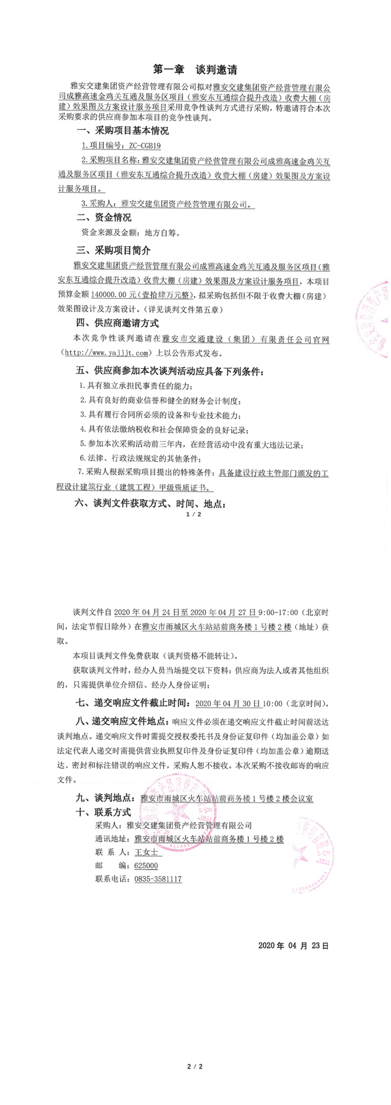 雅安交建集團(tuán)資產(chǎn)經(jīng)營管理有限公司成雅高速金雞關(guān)互通及服務(wù)區(qū)項(xiàng)目(雅安東互通綜合提升改造)收費(fèi)大棚(房建)效果圖及方案設(shè)計(jì)服務(wù)項(xiàng)目競爭性談判公告