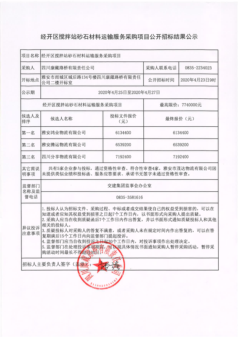 四川康藏路橋有限責(zé)任公司經(jīng)開區(qū)攪拌站砂石材料運(yùn)輸服務(wù)采購(gòu)項(xiàng)目公開招標(biāo)結(jié)果公示