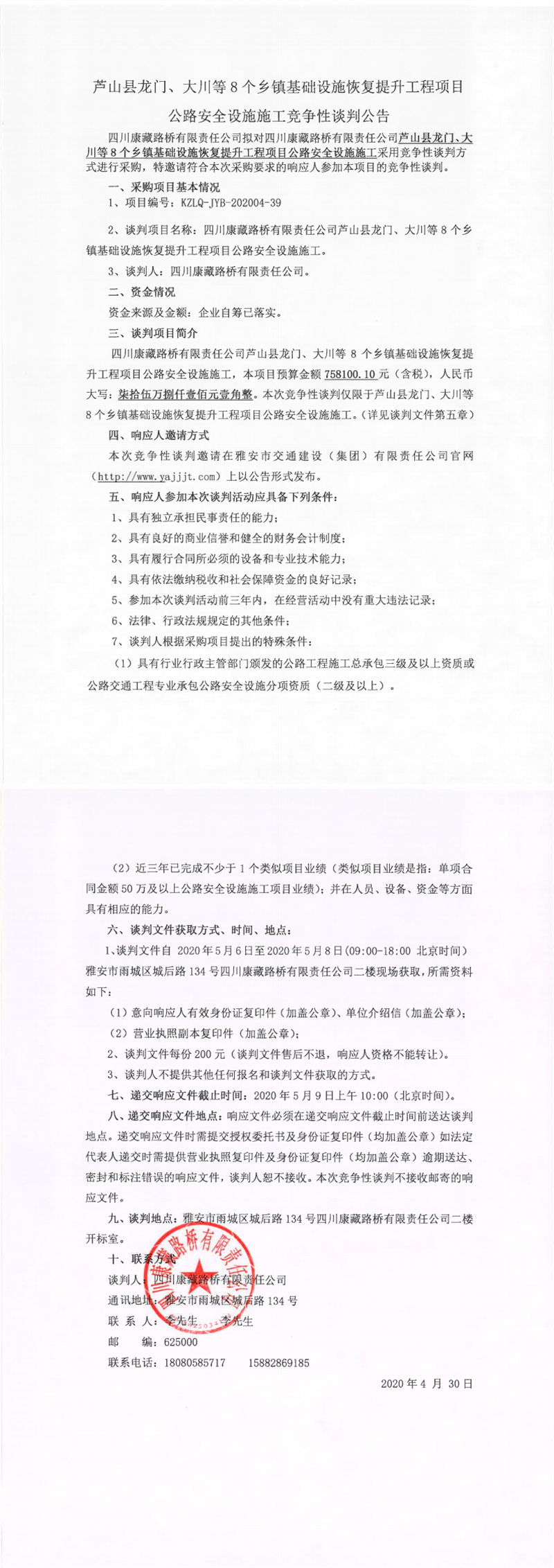 四川康藏路橋有限責(zé)任公司蘆山縣龍門(mén)、大川等8個(gè)鄉(xiāng)鎮(zhèn)基礎(chǔ)設(shè)施恢復(fù)提升工程項(xiàng)目公路安全設(shè)施施工競(jìng)爭(zhēng)性談判公告