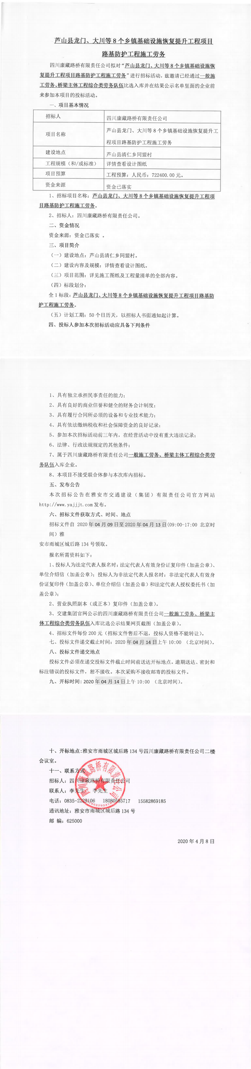 四川康藏路橋有限責任公司蘆山縣龍門、大川等8個鄉(xiāng)鎮(zhèn)基礎(chǔ)設(shè)施恢復提升工程項目路基防護工程施工勞務招標公告