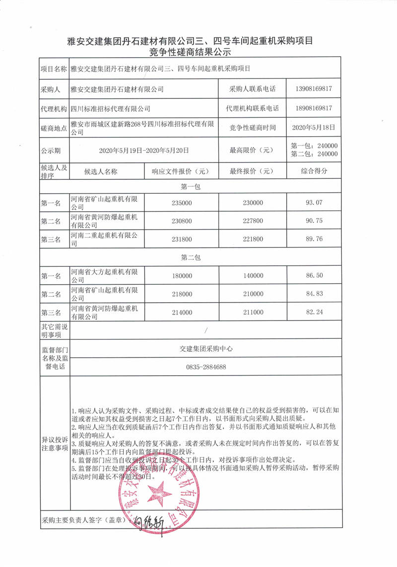 雅安交建集團(tuán)丹石建材有限公司三、四號(hào)車間起重機(jī)采購(gòu)項(xiàng)目競(jìng)爭(zhēng)性磋商結(jié)果公示