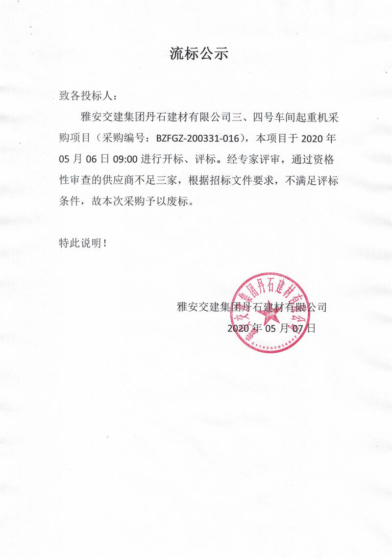 雅安交建集團(tuán)丹石建材有限公司三、四號(hào)車(chē)間起重機(jī)采購(gòu)項(xiàng)目流標(biāo)公示