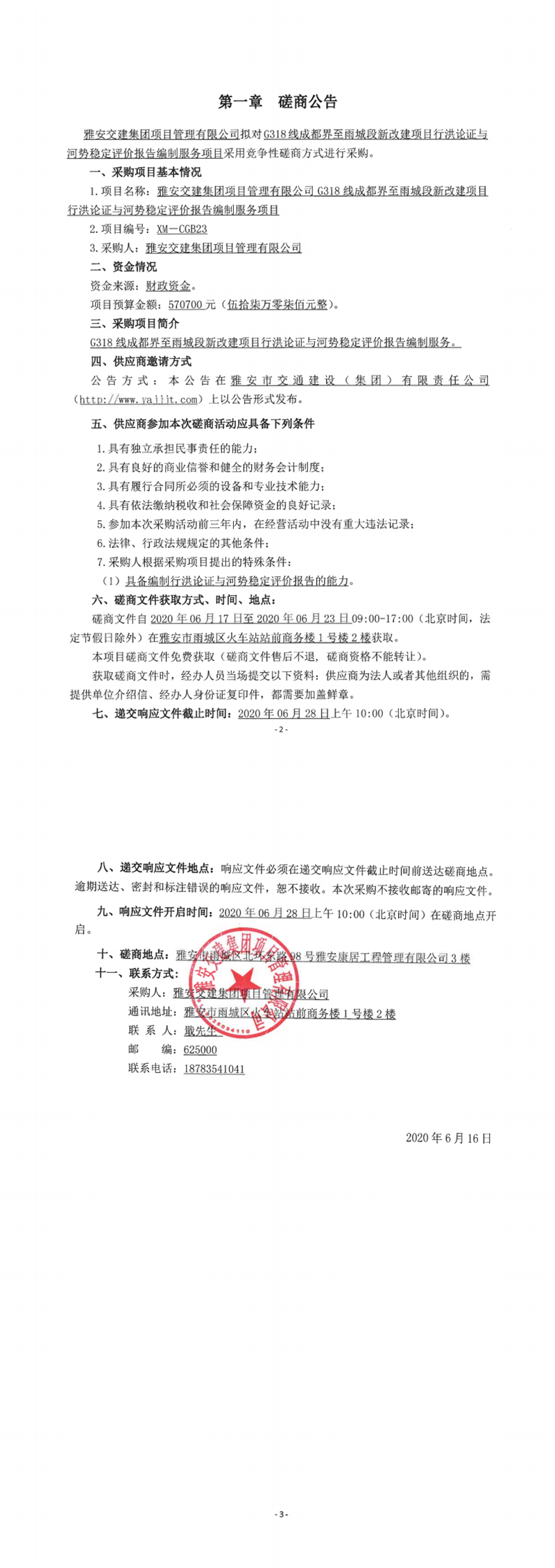 雅安交建集團(tuán)項(xiàng)目管理有限公司G318線成都界至雨城段新改建項(xiàng)目行洪論證與河勢穩(wěn)定評價(jià)報(bào)告編制服務(wù)項(xiàng)目競爭性磋商公告