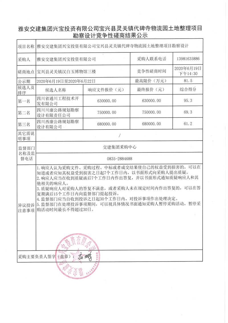 雅安交建集團興寶投資有限公司寶興縣靈關鎮(zhèn)代碑寺物流園土地整理項目勘察設計競爭性磋商結果公示