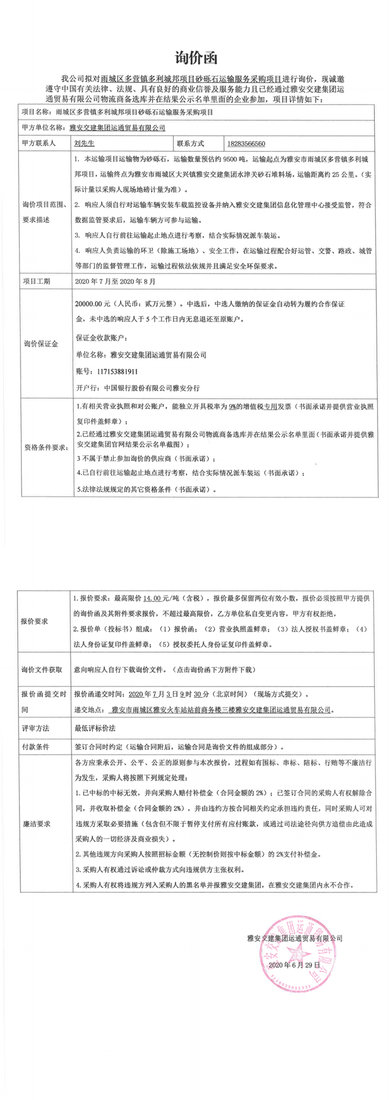 雅安交建集團(tuán)運(yùn)通貿(mào)易有限公司雨城區(qū)多營鎮(zhèn)多利城邦項(xiàng)目砂礫石運(yùn)輸服務(wù)采購項(xiàng)目詢價(jià)函