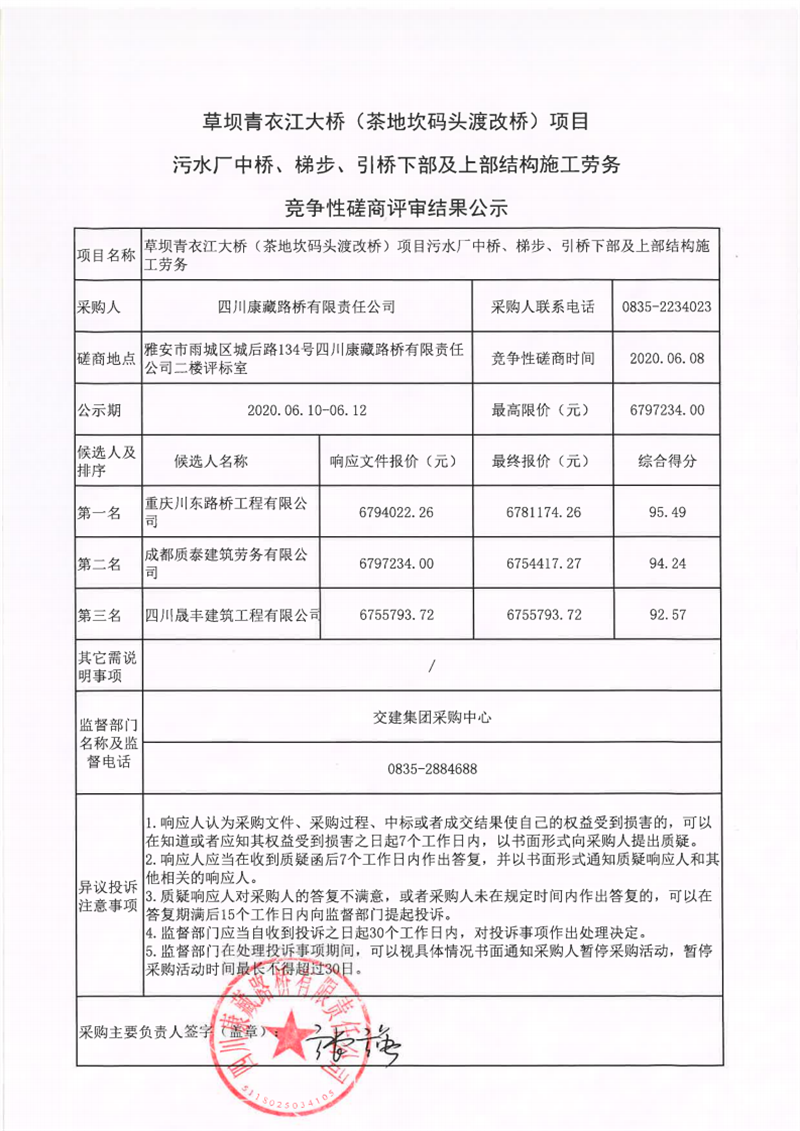 四川康藏路橋有限責任公司草壩青衣江大橋(茶地坎碼頭渡改橋)項目污水廠中橋、梯步、引橋下部及上部結構施工勞務競爭性磋商評審結果公示