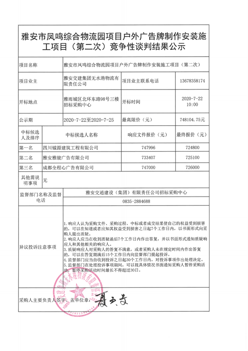 雅安交建集團無水港物流有限責任公司雅安市鳳鳴綜合物流園項目戶外廣告牌制作安裝施工項目(第二次)競爭性談判結果公示