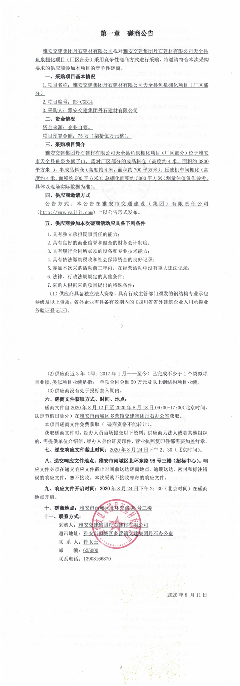 雅安交建集團(tuán)丹石建材有限公司天全縣魚泉棚化項目(廠區(qū)部分)競爭性磋商公告