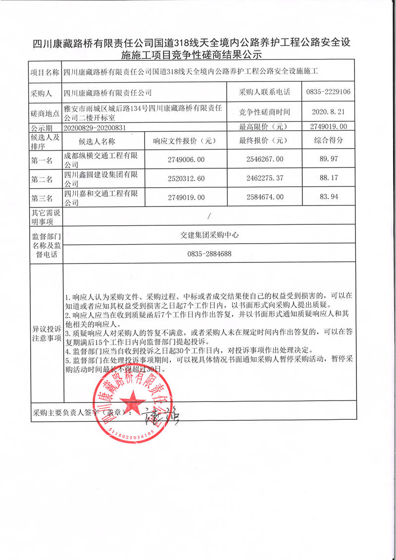 四川康藏路橋有限責任公司國道318線天全境內(nèi)公路養(yǎng)護工程公路安全設(shè)施施工項目競爭性磋商結(jié)果公示