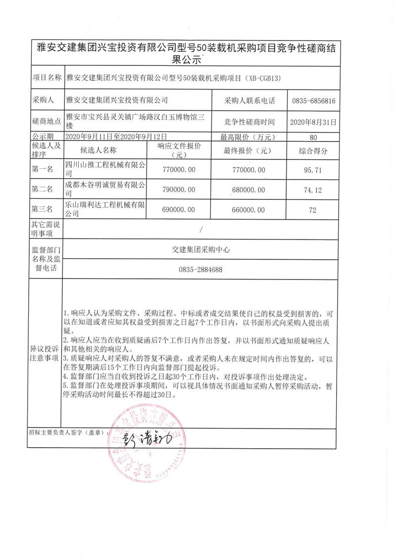 雅安交建集團(tuán)興寶投資有限公司型號(hào)50裝載機(jī)采購項(xiàng)目競爭性磋商結(jié)果公示