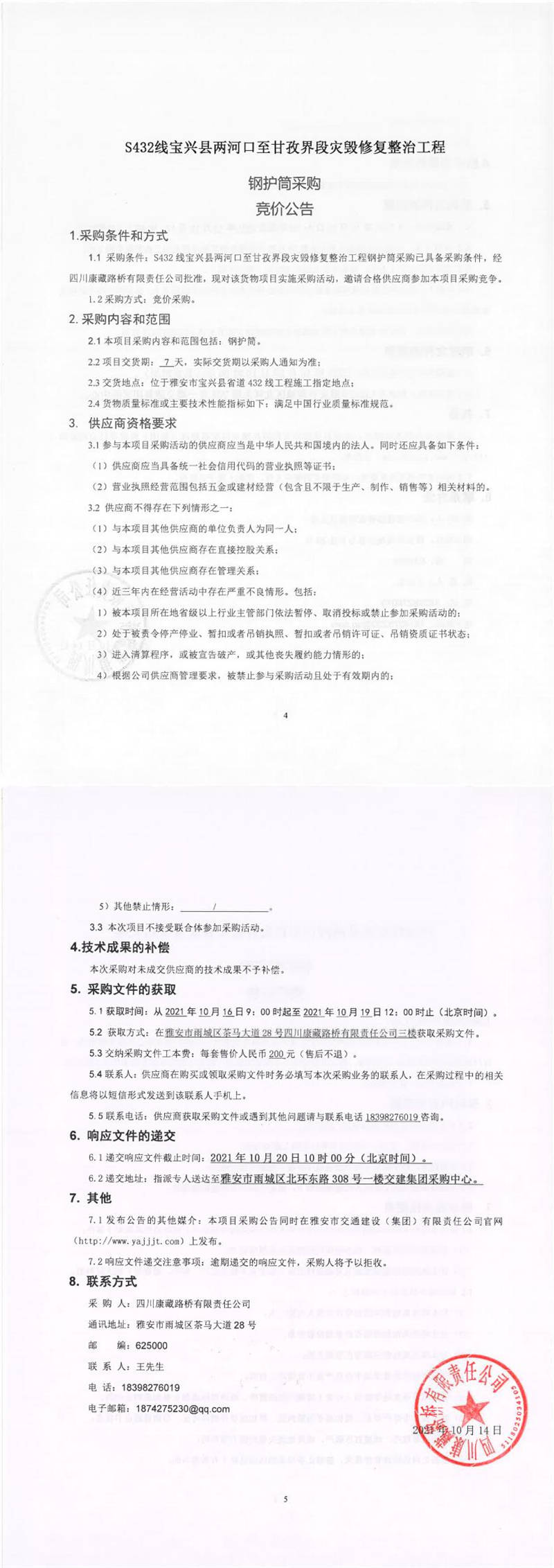 四川康藏路橋有限責(zé)任公司S432線寶興縣兩河口至甘孜界段災(zāi)毀修復(fù)整治工程鋼護筒采購競價公告